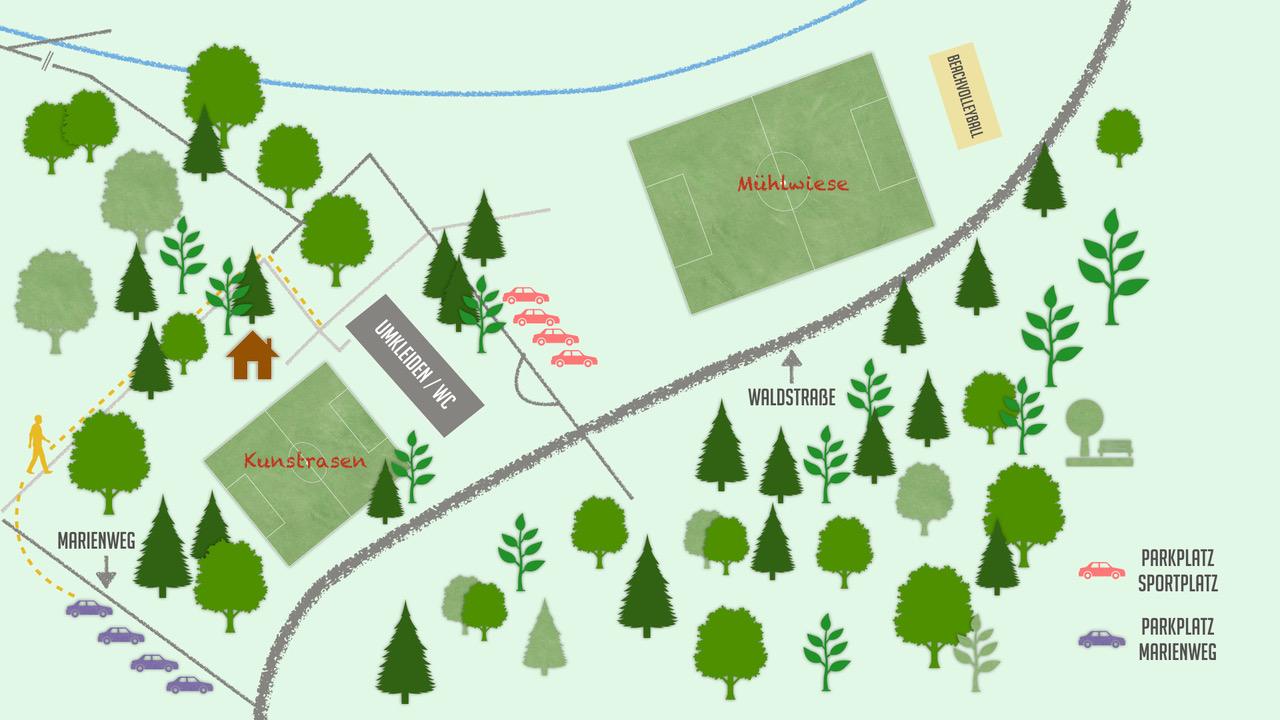 Beim Sportplatz Mühlwiese stehen nur begrenzt Parkplätze zur Verfügung. In Stoßzeiten können diese knapp werden, sodass wir ein Ausweichen in den Marienweg empfehlen. Von dort ist es ein ca. 5 minütiger Fußweg zum Sportplatz.